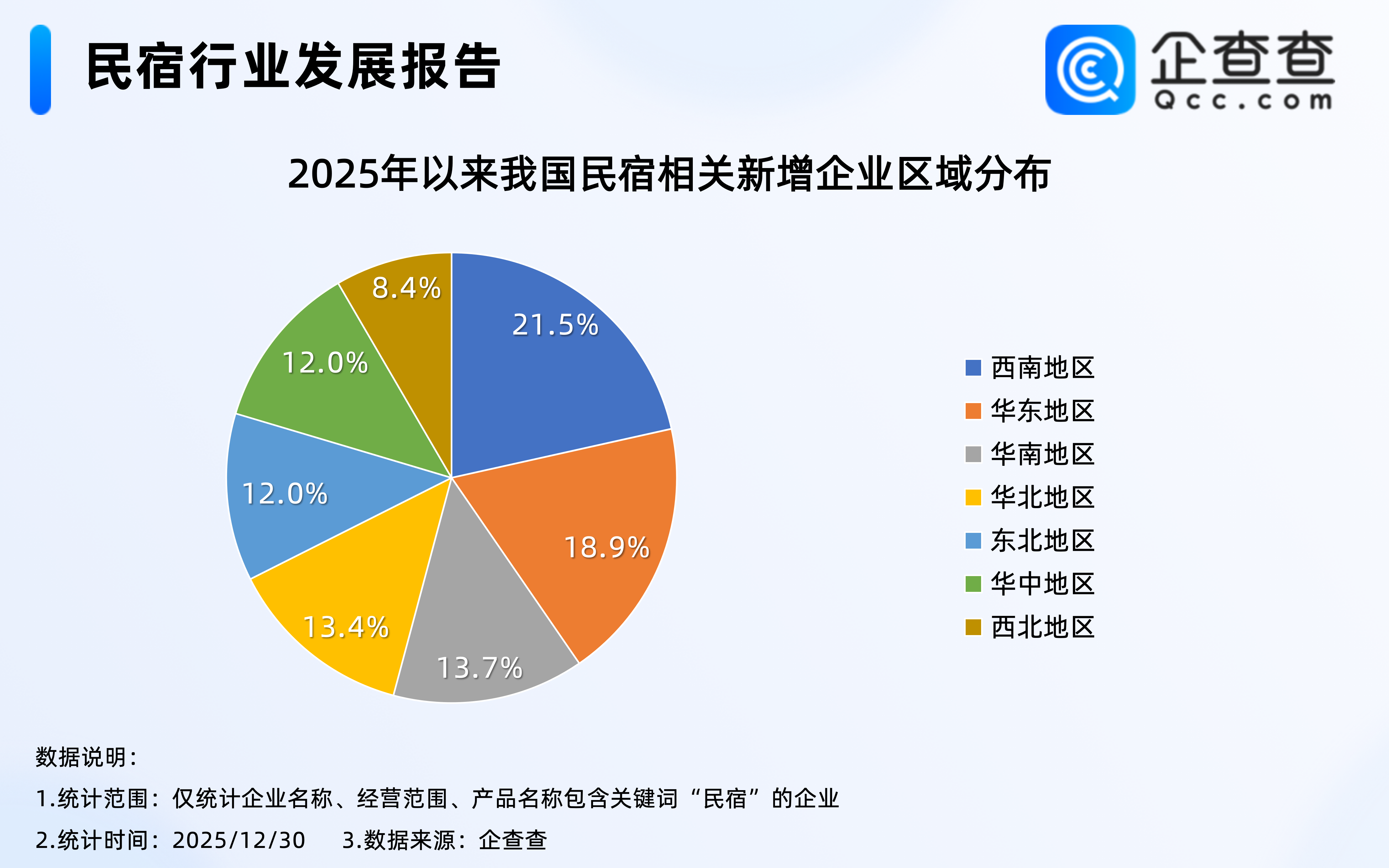 企查查数据显示,截至12月30日,2025年我国已注册8.6万家民宿相关企业,与存量企业区域分布不同的是,西南地区新注册民宿相关企业数量占全国总量的21.5%,超过华东地区,成为2025年以来全国民宿相关企业注册量最大的区域,华东地区占比18.9%。