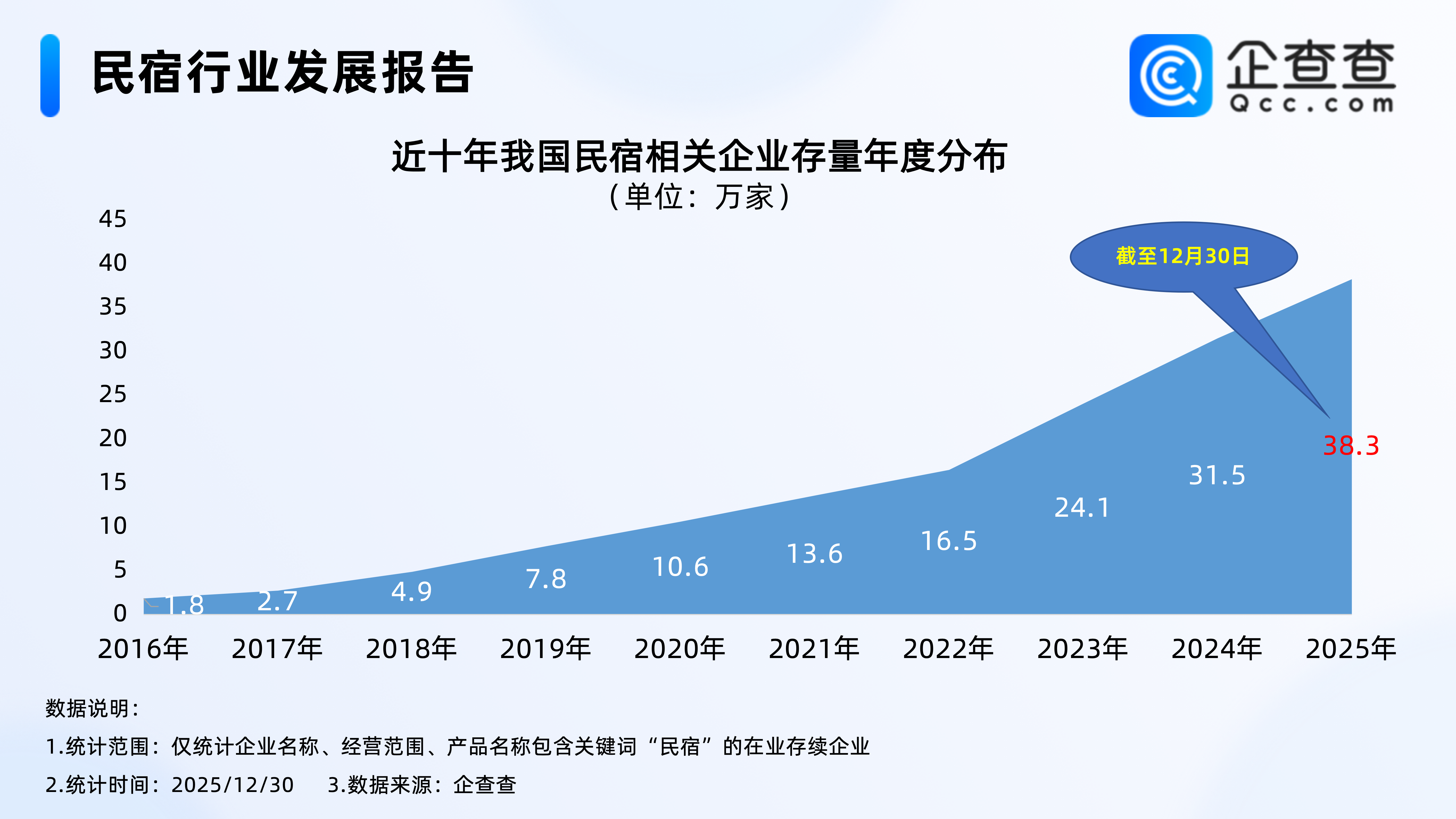 元旦假期旅游热潮将带动民宿市场迎来“预订爆发+场景升级”双重高峰。途家数据显示,“包栋别墅”跨年成为最流行的方式之一,元旦期间,平台民宿平台上的独栋别墅预订量同比增长1.4倍,在所有房型中增速最快。“00后”成为民宿消费主力,元旦民宿预订量占比达52%,同比增长1.7倍。2026年元旦假期民宿预订火热,木鸟民宿元旦当日订单比去年同期上涨164%,跨年游带动元旦假期民宿订单增长,跨年夜民宿订单较元旦当天高30%。同程旅行数据印证,广州、三亚等避寒城市民宿订单涨幅介于50%至246%之间,“包栋跨年”“仪式感住宿”成为核心消费趋势。供需两旺下,民宿行业正凭借场景化、个性化优势,持续承接假期旅游消费红利。企查查数据显示,截至12月30日,我国现存38.3万家民宿相关企业至慧策略,区域分布上,我国华东地区民宿相关企业存量最多,占全国总存量的26.2%,其次是西南地区,占比18.1%;注册量方面,截至12月30日,2025年以来我国已注册8.6万家民宿相关企业,与存量区域分布不同的是,新注册企业中,西南地区占比21.5%,超过华东地区至慧策略,成为2025年以来,全国新注册民宿相关企业最多的区域。1.从企业存量来看:我国现存38万余家民宿相关企业