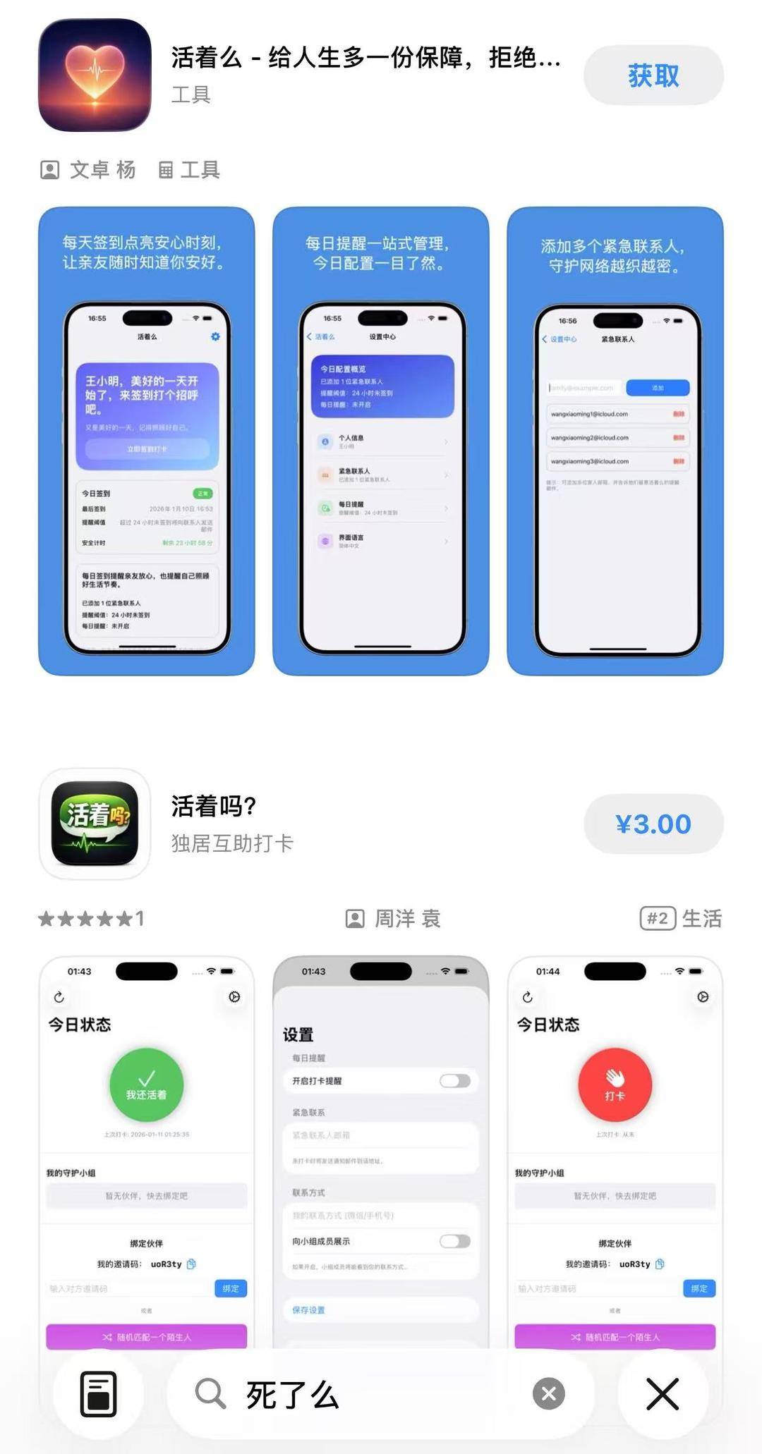 值得注意的是,扬子晚报/紫牛新闻记者查询苹果应用商店发现,独居安全工具赛道已出现多款同类产品。除了“死了么”,还有“活着么”“活着吗”等多款APP,这些应用同样定位为“独居人群安全工具”,可见独居安全这一需求已受到市场广泛关注。
