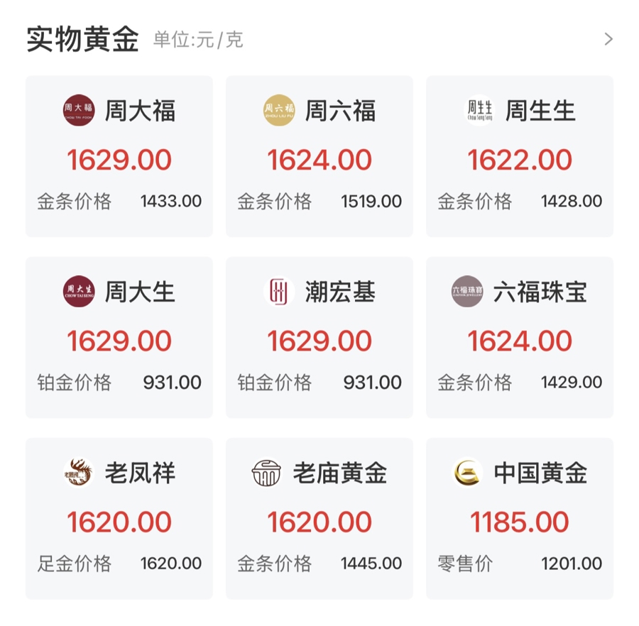 同时,国内金价更是大幅上涨。截至发稿,上海金价格达到每克1194元,涨幅接近4.28%。国内各大金饰品牌也大幅上调金价。3月2日,周大福金价报每克1629元(上一日为每克1608元),老凤祥报每克1620元(上一日为每克1575元)。